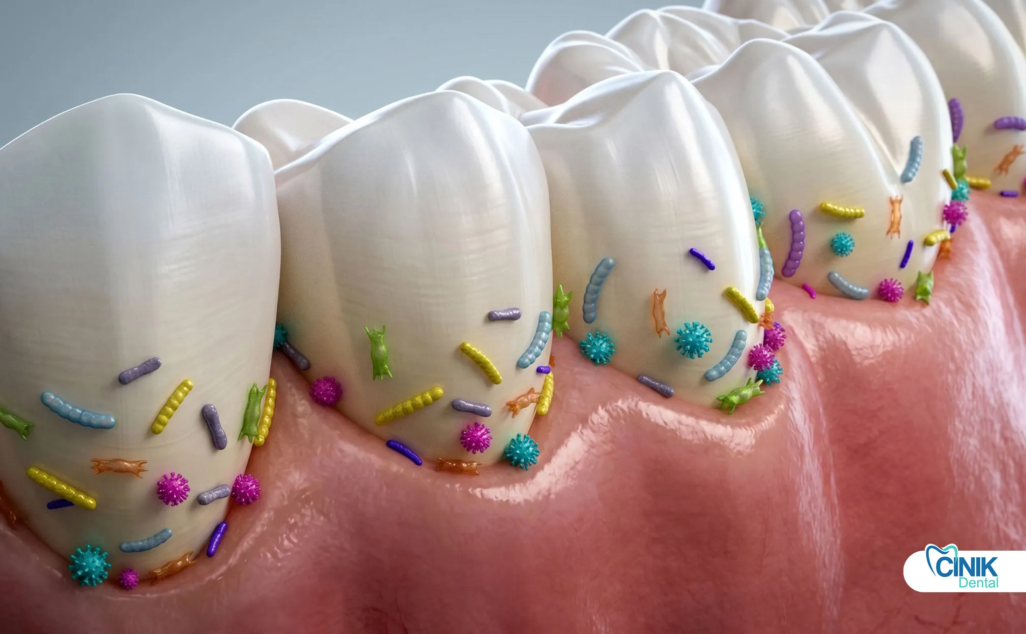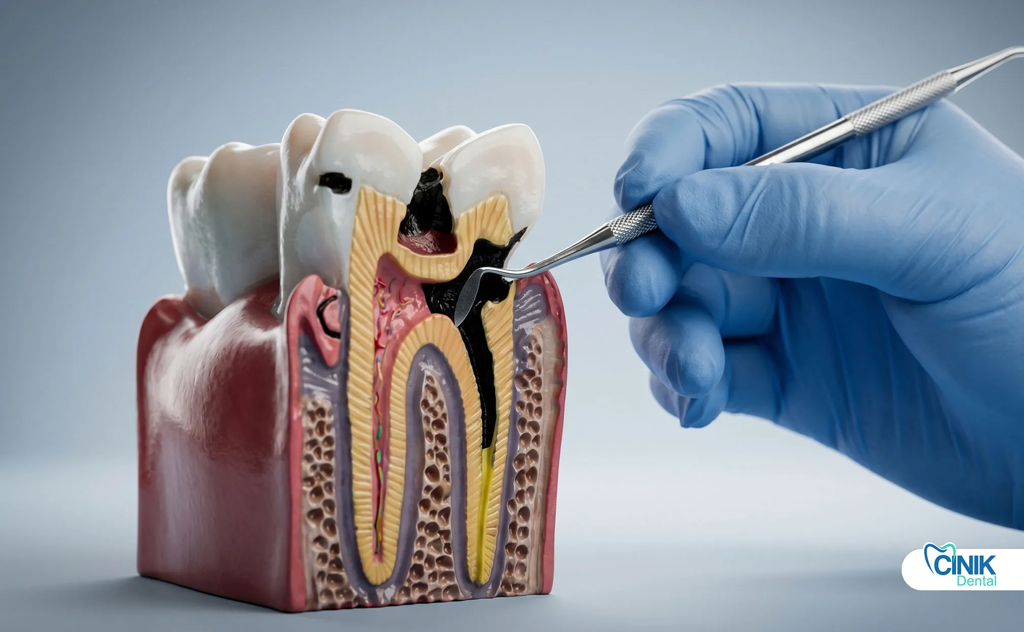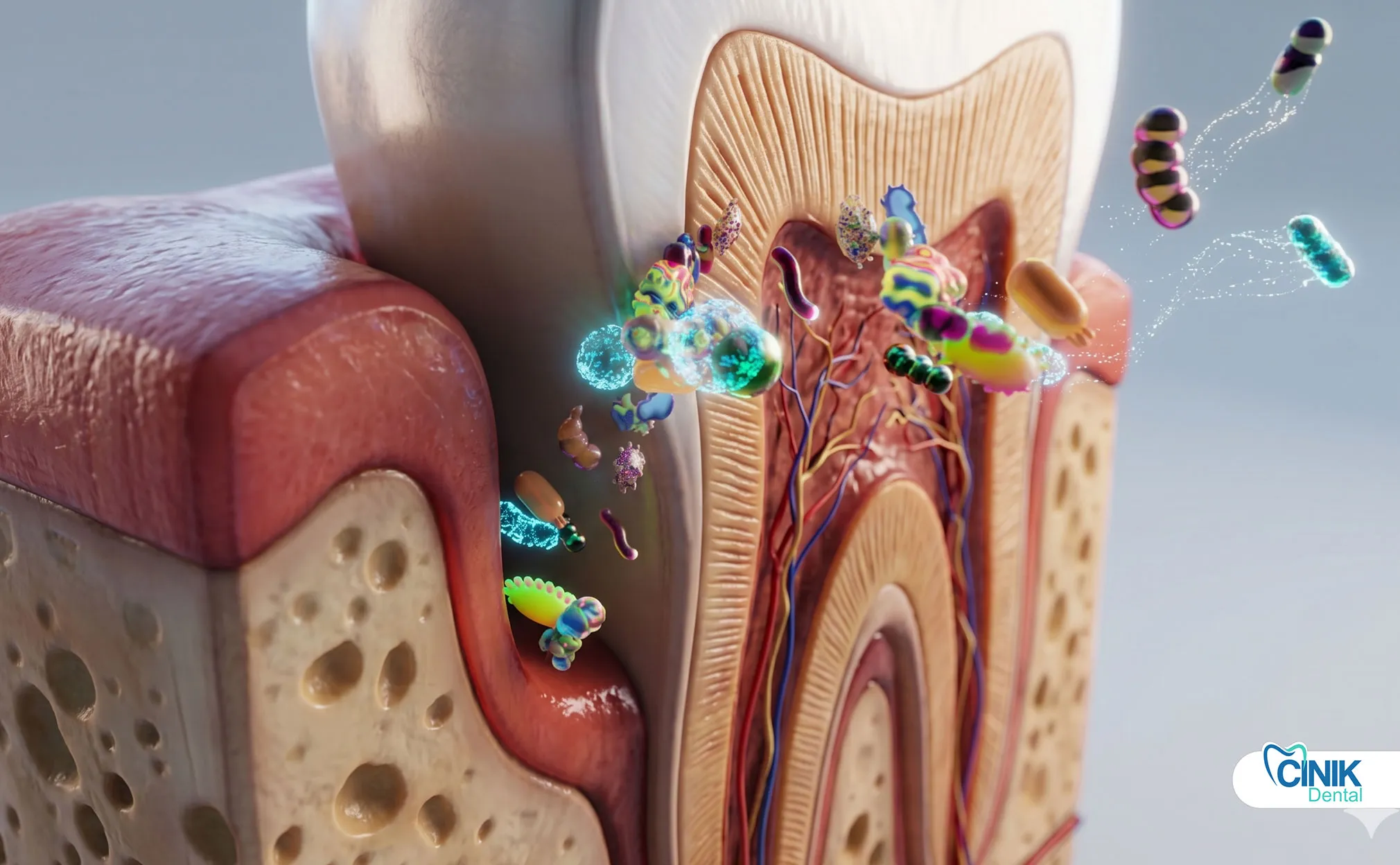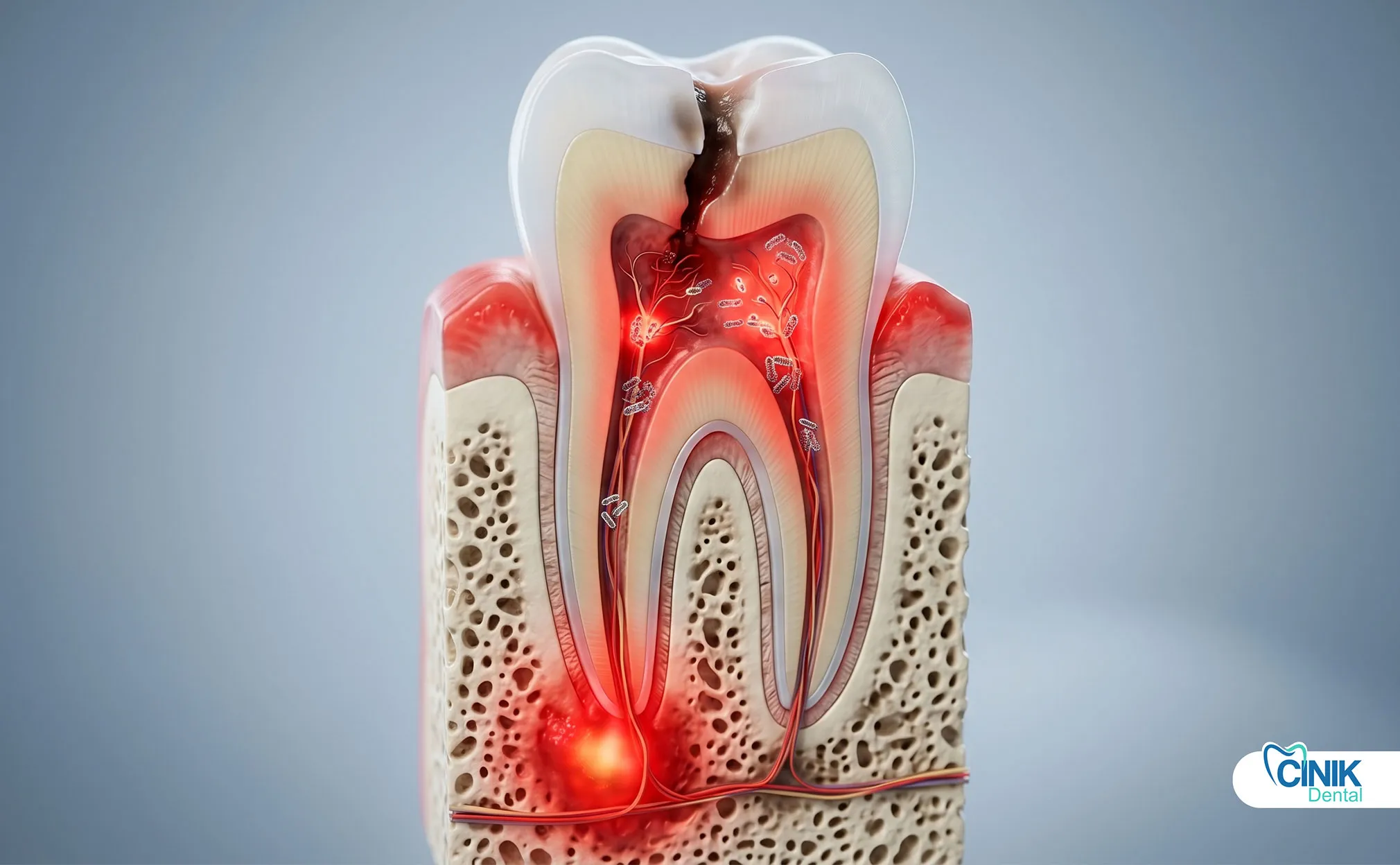 Bacteria enter through enamel cracks, deep cavities, or gum pockets. They form biofilms that resist immune attacks and antibiotics, then destroy pulp, bone, and soft tissue.
